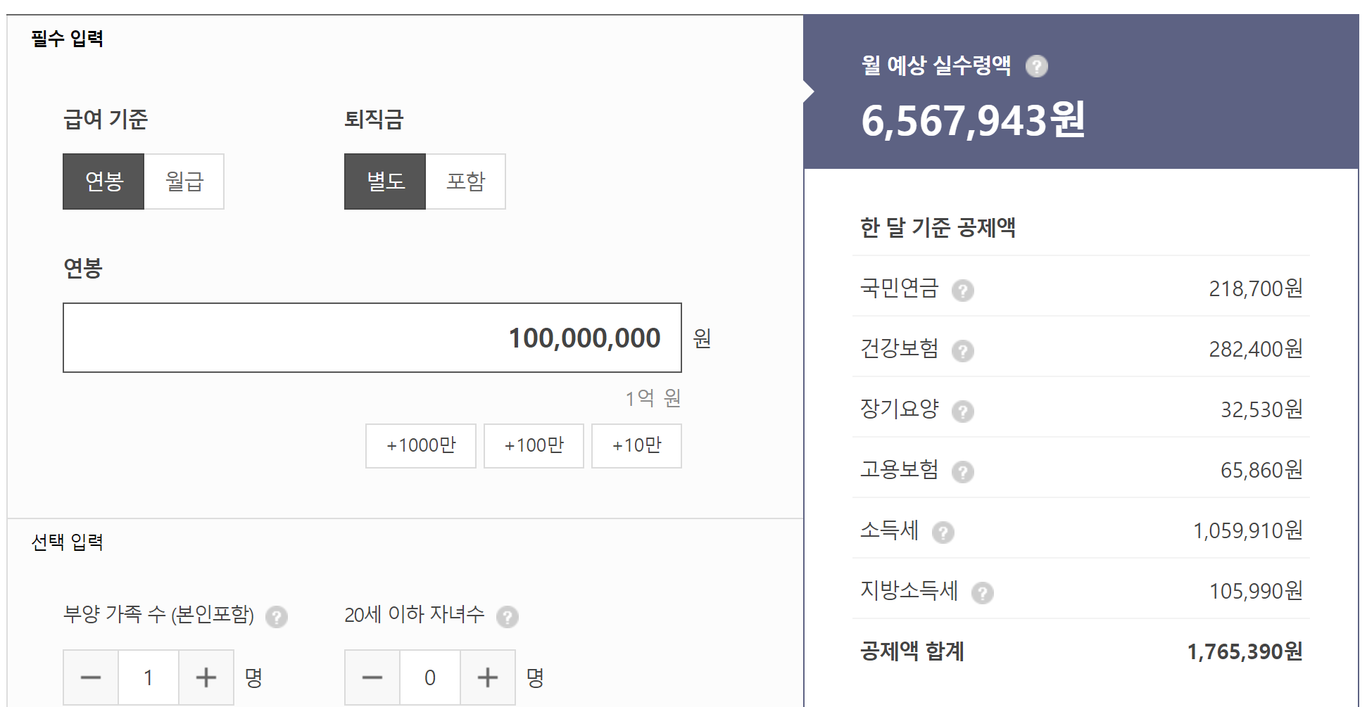 우선, 우리의 로망 연봉 1억의 실수령액을 알아보겠습니다.