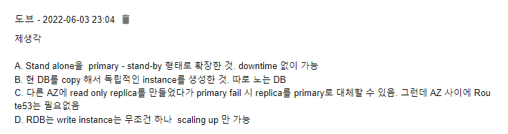 결국, 시험에 처음 느낌 온 게 답인 경우가 많다고 하더니.... 다중 AZ 배포라고 RDS 사용 설명서가 있다. 이건 외워야겠다.