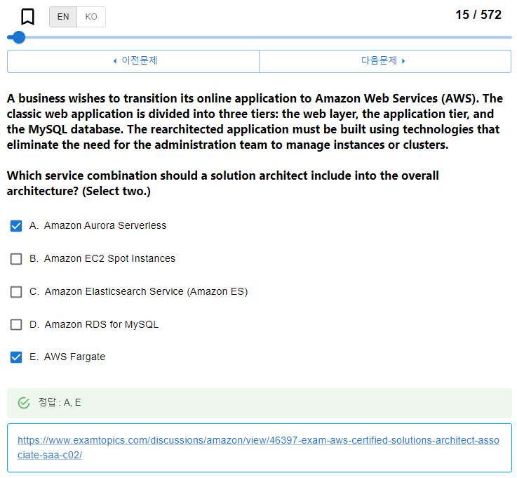 인스터스와 클러스터 관리를 안하고 싶다고 했으니 인프라에 대한 관리를 안하고 싶어하는 것으로 보인다. 이런 경우에는 서버리스 아키텍처가 잘 맞는다. 서버리스 아키텍처에 주로 사용되는 서비스는 AWS Fargate, Aurora Serverless 이름부터 서버리스가 있다. 그러므로 정답은 A, E. 정답 확인.