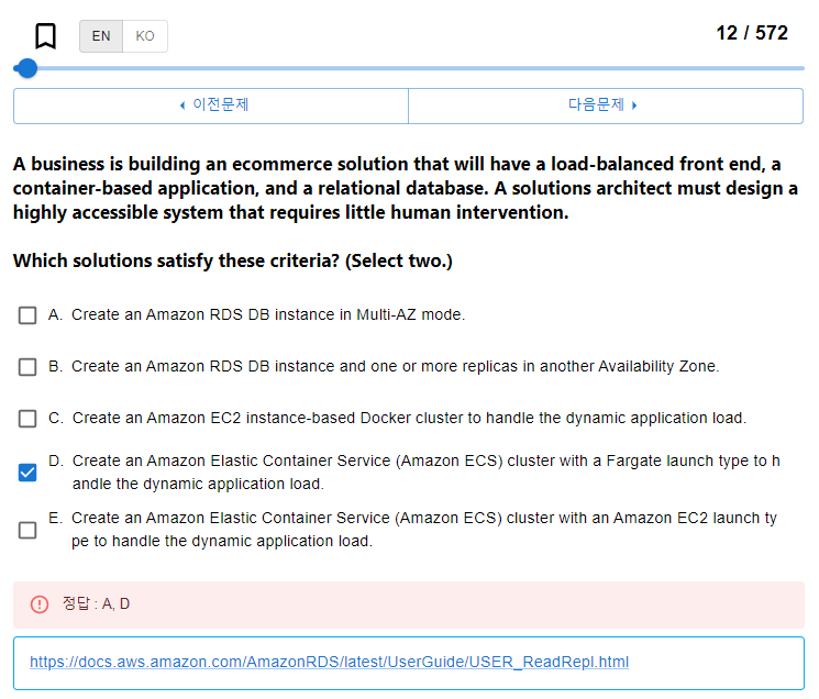 B. 이것도 RDS DB 인스터와 AZ만 복제해서는 문제에서 준 상황, 프론트 엔드에 로드밸런서랑 어플리케이션 컨테이너에 도움이 안될거 같음