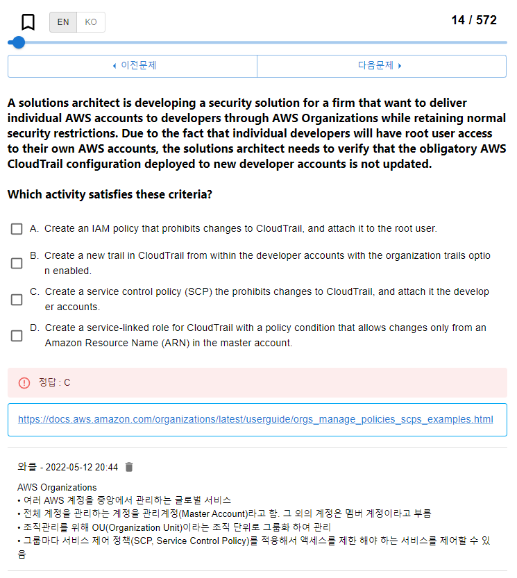 A. 문제에서는 AWS Organizations 을 통해 개별 AWS 계정을 제공하려고 하는데 IAM은 Organizations 단위가 아닌거 같다. 그래서 정답이 아님.