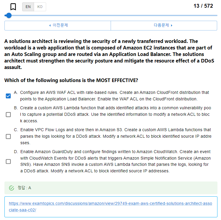 A. DDoS 공격에 대해 리소스 영향을 감소시키기 위해 흔히 사용하는 것이 WAF다. 그 외로 여기서는 CloudFront를 사용하는 방법까지 제안하고 있는데, CloudFront를 사용하면 실제 소스가 있는 리소스까지 접근하기 전에 앞단에서 공격을 받아 차단까지 할 수 있기 때문에 문제에 대한 정답으로 보인다.