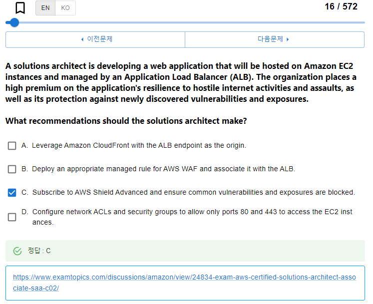 C. AWS Shield는 AWS에서 제공하는 보안의 기본중 기본 서비스로 사용되는데, 여기서는 비용에 대한 언급도 없고 보안적인 측면만 고려한다면 Shield Advanced 가 정답이 되겠다.