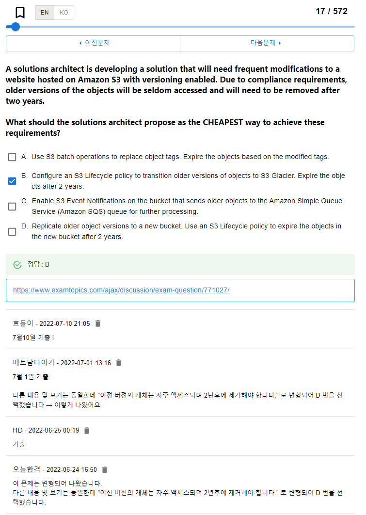 이 문제가 최근에 자주 접근하지 않는 것에서 자주 접근 하는 것으로 문제가 변형되어 나왔다고 한다. 자주 이전 버전의 S3개체를 접근 한다면, 이전 버전은 복제하여 관리한다는 D가 정답이 된다.