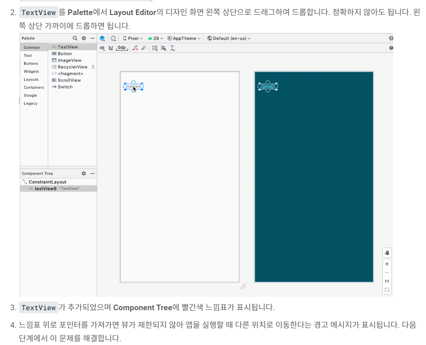 이제 용어 설명 이후에 안드로이드 스튜디오에서 View와 Layout 같은 화면들을 설정하는 방법에 대해 설명이 되어있습니다. 이것은 어려운 부분이 아니라고 생각되어 넘어가겠습니다. 천천히 읽어보시고 급하게 빠르게 이것저것 막 눌러보는 것보다 한 줄 한줄 읽어가면서 알려주는 대로 따라 하시는 걸 추천드립니다.