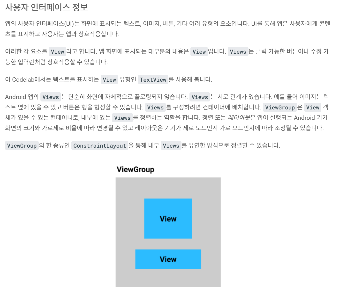 View는 앱 화면에 표시되는 것. Views도 앱화면에 표시되는 것인데 사용자와 상호작용 할 수 있는 것. ViewGroup은 View와 Views의 그룹을 만들어 영역을 제한하는 것.입니다. 이게 기본적인 틀과 용어이고 세부적으로는 TextView, EditView 등등 용도에 따라 뷰의 이름을 다르게 부릅니다.