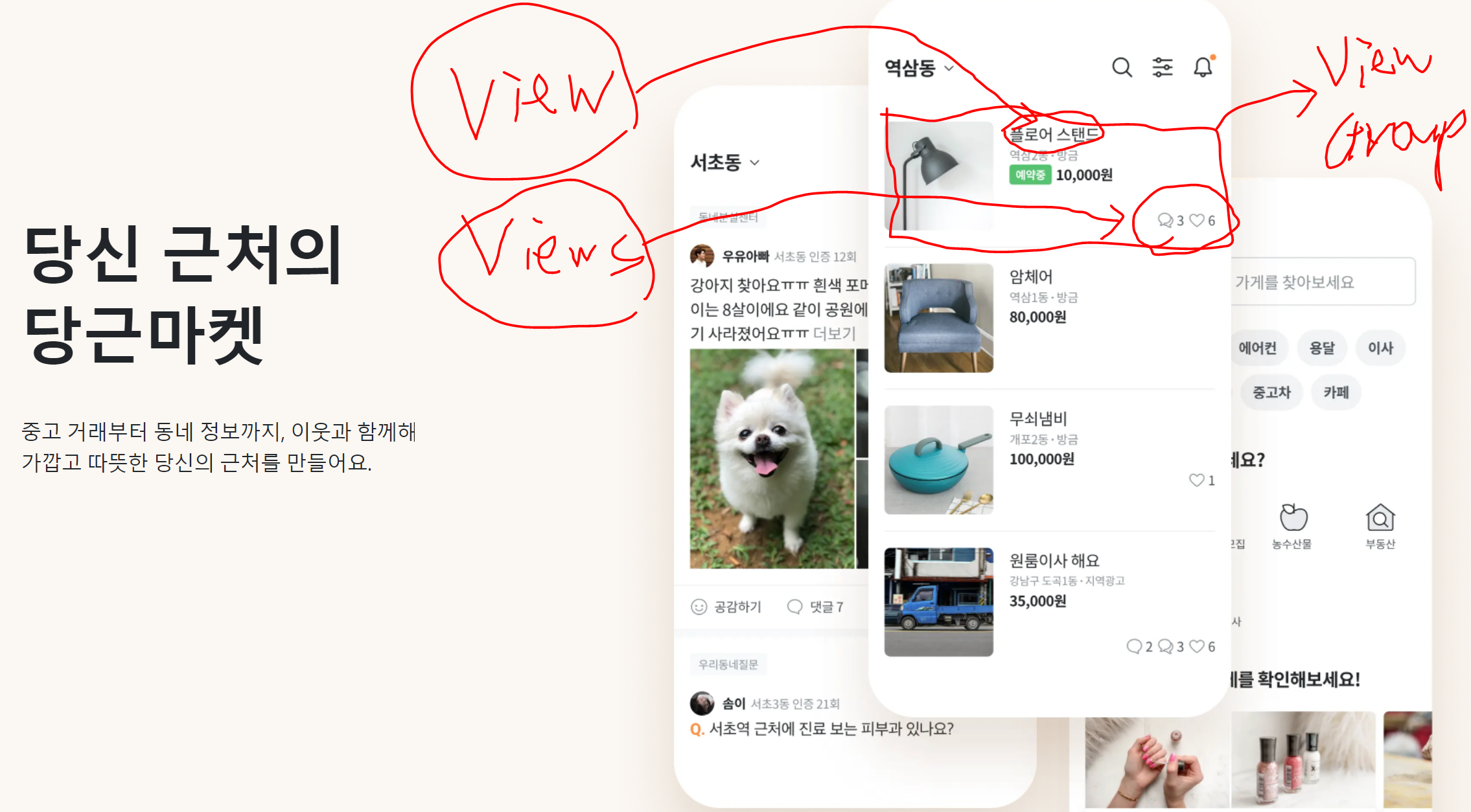 우리가 실제로 사용하는 앱을 예시로 설명해보겠습니다. 당근마켓 홈페이지에 들어가서 앱 화면을 보겠습니다.