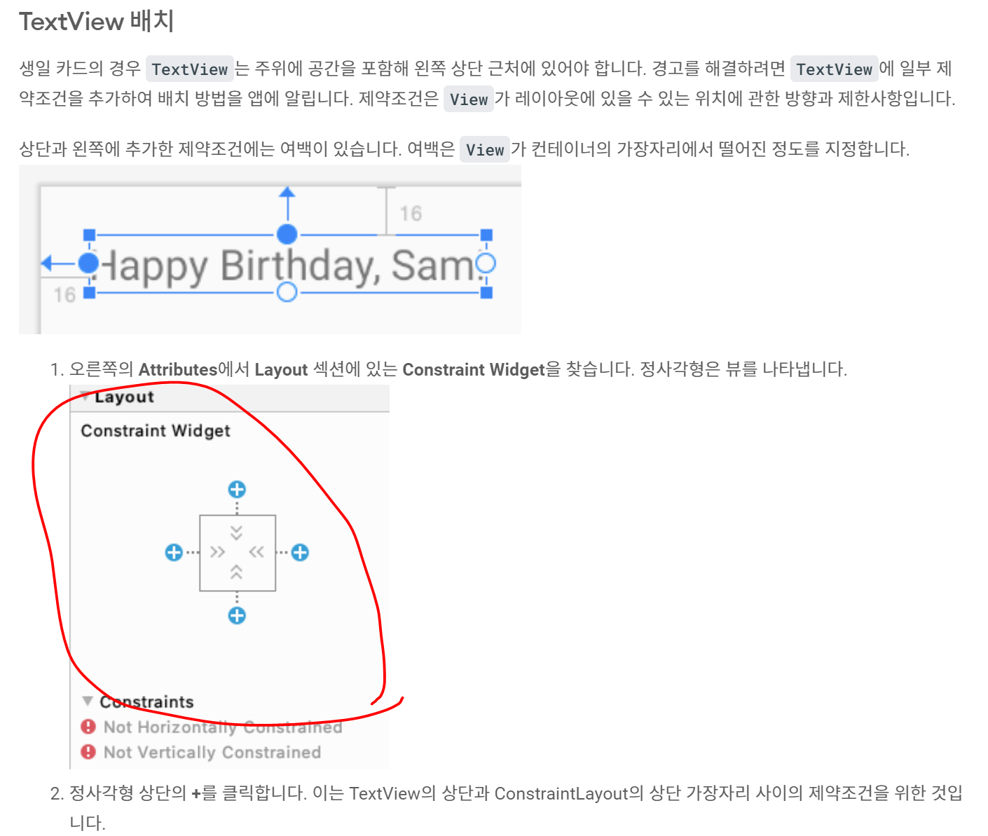 저는 아래 그림처럼 뷰의 위치를 이동시키는데 생각보다 매끄럽게 되지 않아서 살짝 당혹스러웠습니다. 여러분들도 하실 때 잘 읽고 시행착오를 몇 번 겪어보시면서 ConstrainLayout 이 어떻게 작용하는지 경험하시면 좋을 거 같습니다.