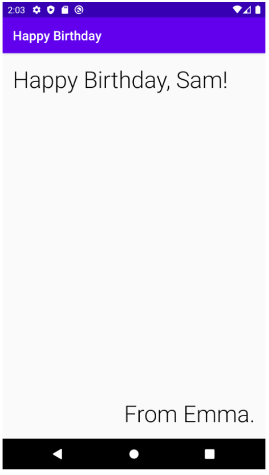 이번에 학습할 내용에 Views, ViewGroups, TextView 이런 단어들이 보입니다. 저런 단어들과 개념을 이해하면 저기 보이는 Happy Birthday, Sam! 이라는 문구를 작성하고 보여줄 수 있는 거 같습니다. 다음으로 넘어가 보겠습니다.