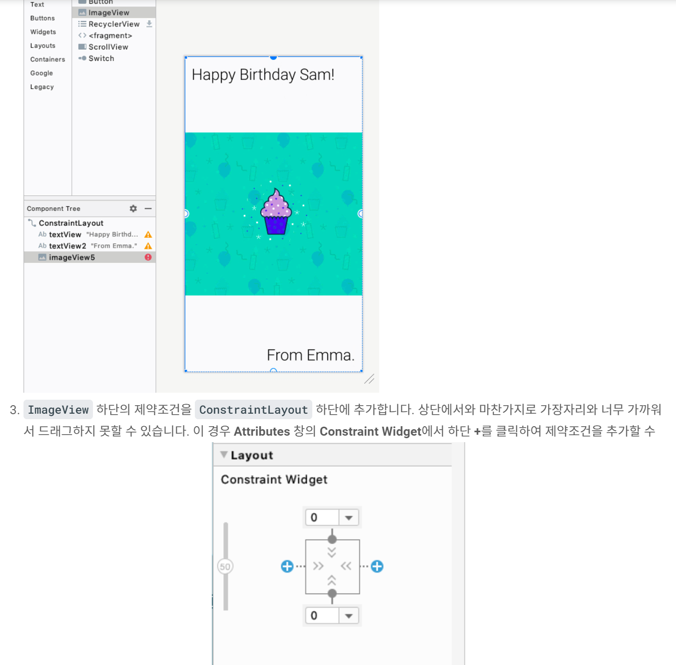 이제 설명에 따라 ImageView라는 이미지 도화지를 추가하고, ImageView 안에다가 안드로이드 스튜디오에 추가한 이미지를 표현하게 설정을 해줍니다.