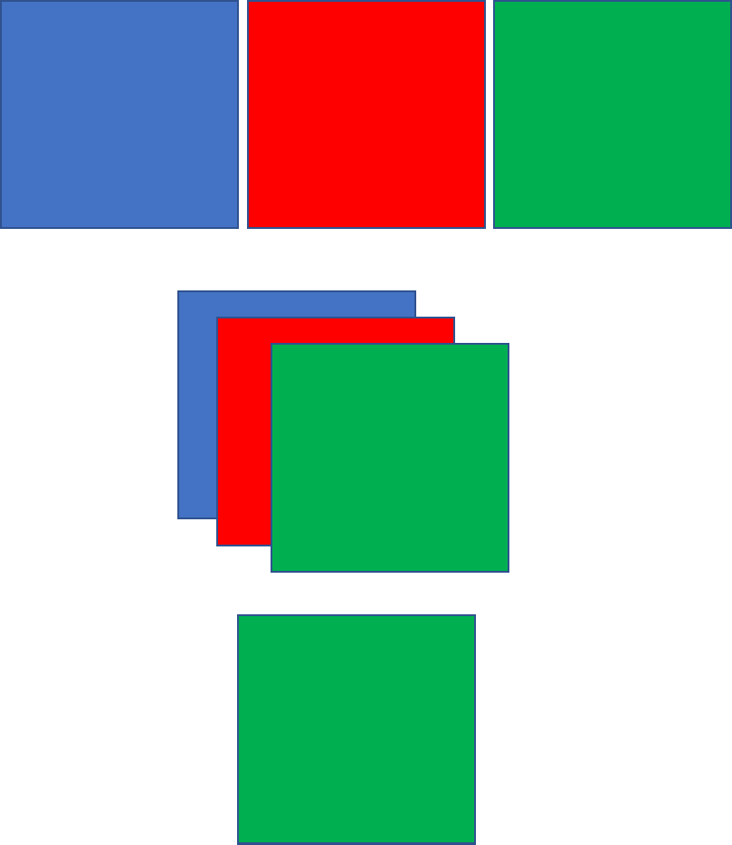 예를 들면, 각기 다른 색을 가진 색종이가 3개 있다고 가정해보겠습니다. 그 색종이 3개를 나란히 두면 모든 색종이가 보이게 됩니다. 다음으로는 순서대로 일부 영역을 겹쳐서 쌓게 되면, 겹 처진 부분은 맨 위에 있는 종이의 색이 보이게 됩니다. 모두 한 곳으로 겹치게 되면 어떻게 될까요? 맨 위에 있는 색종이만 보이게 됩니다. 컴퓨터나 핸드폰에서 보이는 화면도 마찬가지로 최종적으로 위로 올라온 뷰만 보이게 됩니다.