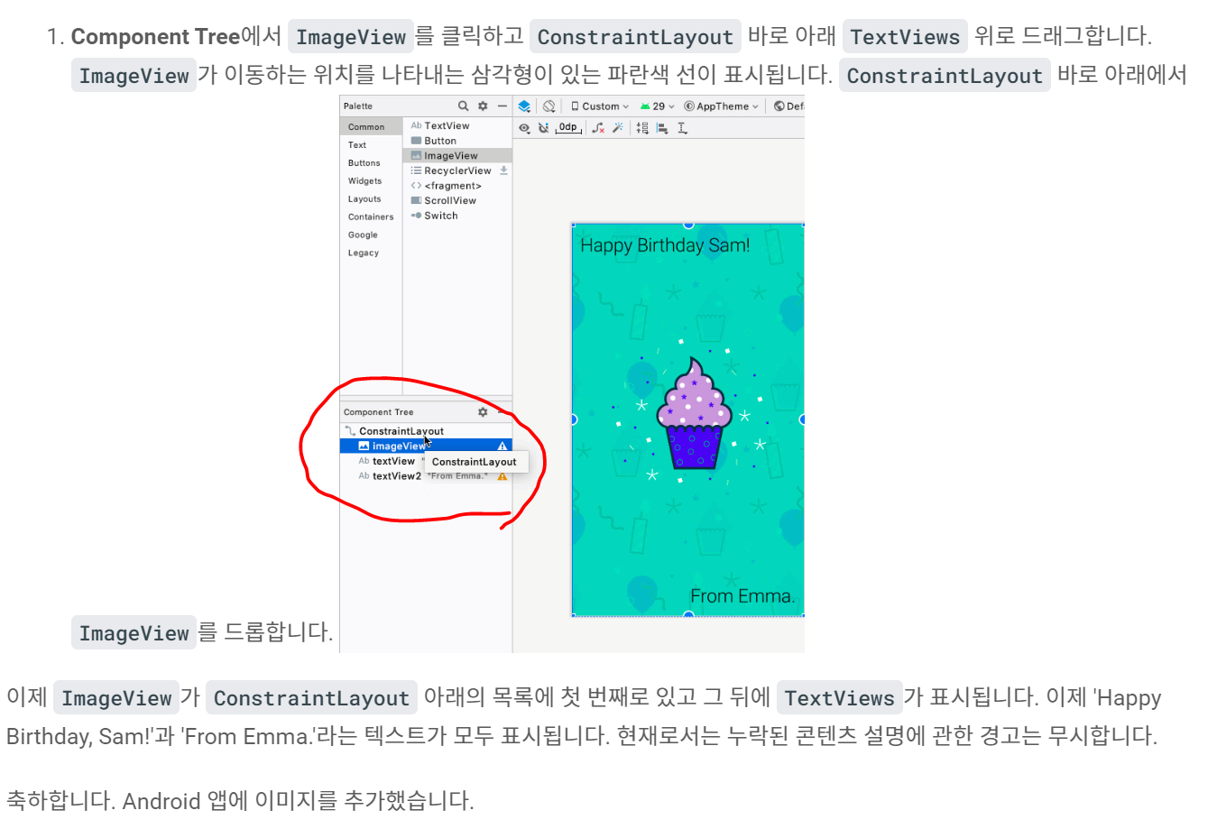 그렇다면 우리가 추가한 이미지와 글씨가 동시에 보이게 하려면 어떻게 해야 할까요? 이미지 뷰라는 색종이를 맨 앞에 두는 것이 아니라 맨 뒤에 두고 그 위에 글씨들을 올려두면 됩니다. 아래 그림은 안드로이드 스튜디오에서 그 방법을 어떻게 하는지에 대해 설명한 그림입니다. 설명에 따라 뷰의 순서들을 바꿔주면 이미지 배경이 전체를 차지하면서도 글씨가 보이게 됩니다.