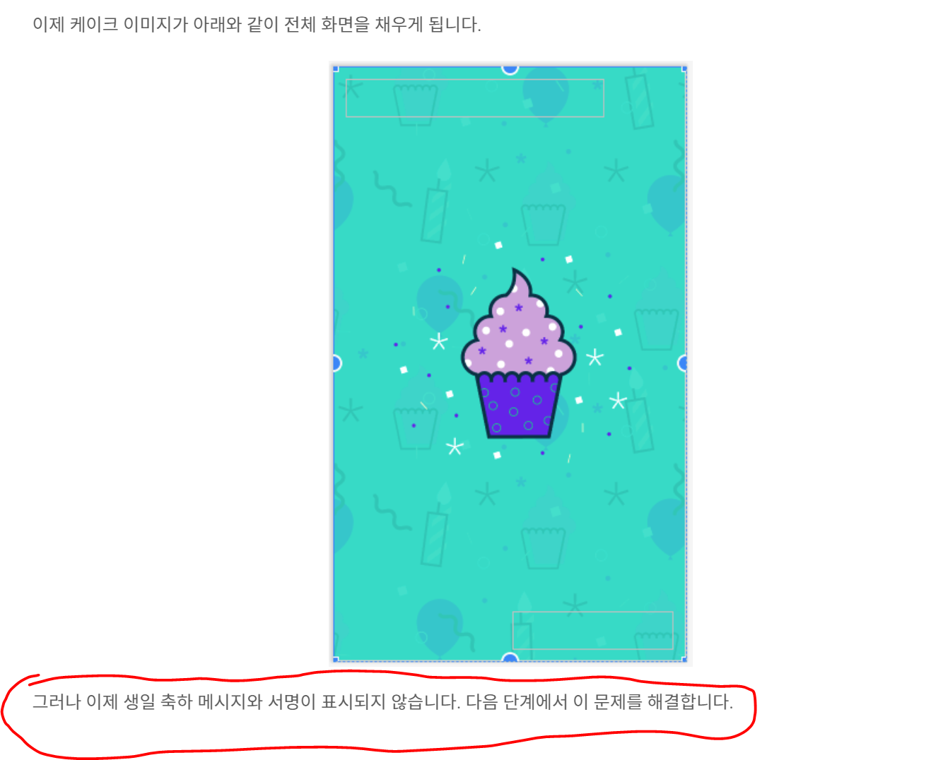 이것저것 눌러보면서 삽질도 좀 하다 보면, 가이드대로 아래 그림처럼 글자와 이미지가 보이게 됩니다. 내가 만들고자 하는 앱에서 이미지가 가운데에만 보이게 하는 거라면, 여기서 끝내면 되겠지만 내가 의도하는 화면은 이미지가 뒷배경 전체에 보이게 하고 싶다면 다른 설정을 또 건드려봐야 합니다. 이런 내용은 사이트에 접속해서 따라 하시면 내용이 또 있습니다.
