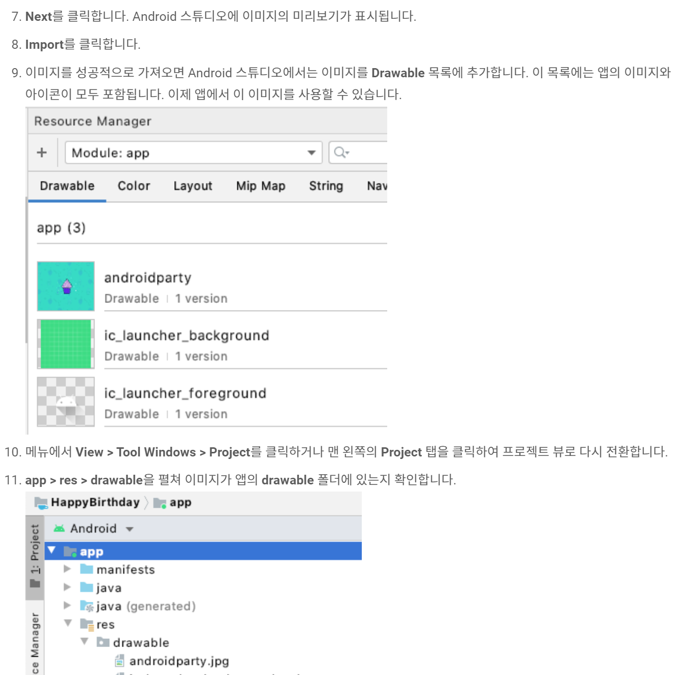 이미지를 다운로드하고, 아래 그림과 같이 안드로이드 스튜디오의 메뉴를 통해 이미지를 추가합니다. 안드로이드 스튜디오가 뭔지 모르신다면 학습을 할 수 없습니다. 첫 번째 포스팅부터 하나씩 따라와 주세요. 이미지를 추가하는 작업은 안내하는 그림을 따라서 누르기만 하면 되는 것이라 크게 어려움이 없었습니다.