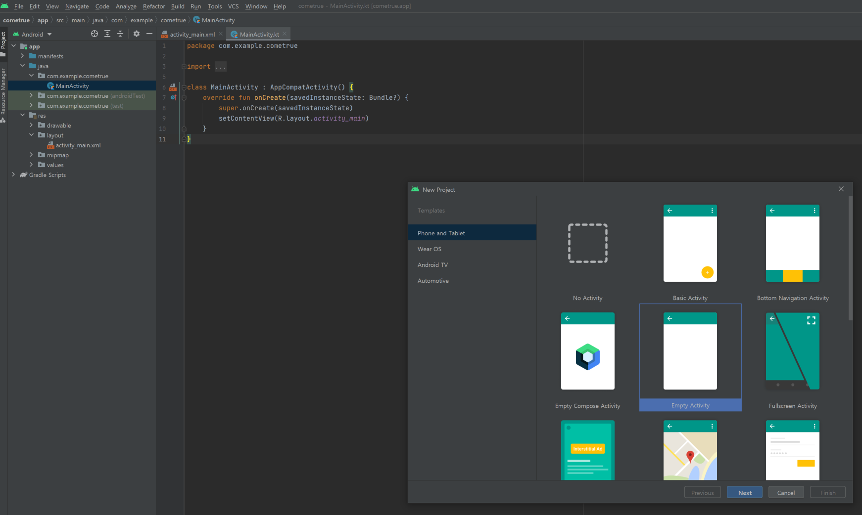 저는 꿈과 목표에 관련된 앱을 만들 예정이라, cometrue 실현하다. 이루다. 뜻을 가진 영어 단어를 Name에 사용하였습니다. Save location 정보에 comtrue2가 붙은 이유는 이미 cometrue라고 만들어 놓고 글을 작성하기 위해 이름을 중복해서 사용해서 프로그램에서 자동으로 중복을 피해 준 것입니다. Finish 버튼을 눌러 새로운 프로젝트 생성을 마무리 합니다.