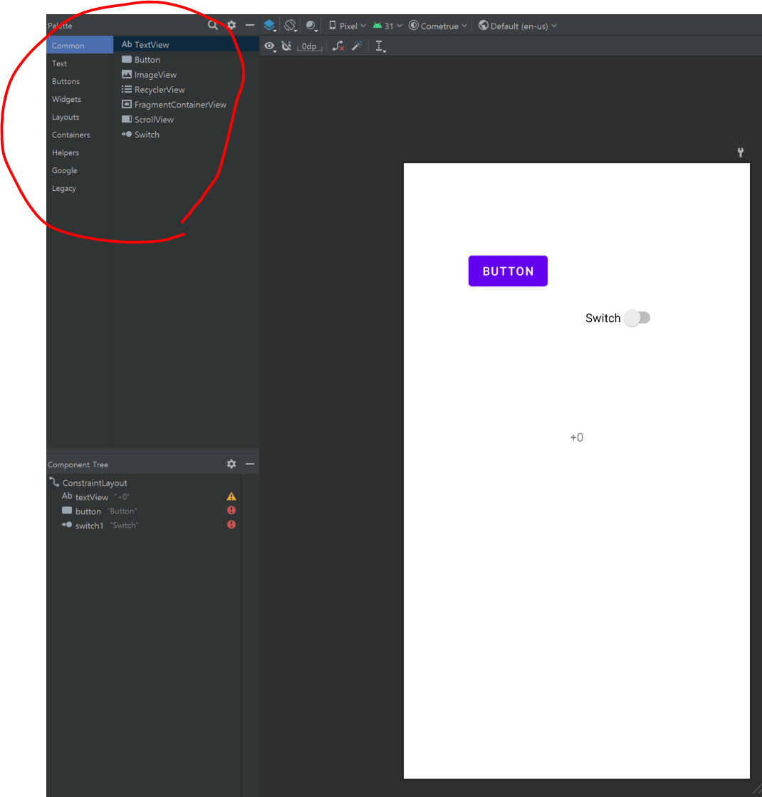 기존에 TextView와 ImageView에 대해 공부했었고 TextView를 내가 원하는 글자를 표현할 수 있습니다. 저는 화면 가운데 상단에 사용자가 몇 번 입력했는지 표시해주고 싶습니다. 그래서 그걸 TextView로 보여주면 되겠다 생각이 들어, 우선 TextView를 추가했습니다. 그리고 TextView의 Text 속성에 0+라는 텍스트를 입력하여 화면에 보이게 만들었습니다.