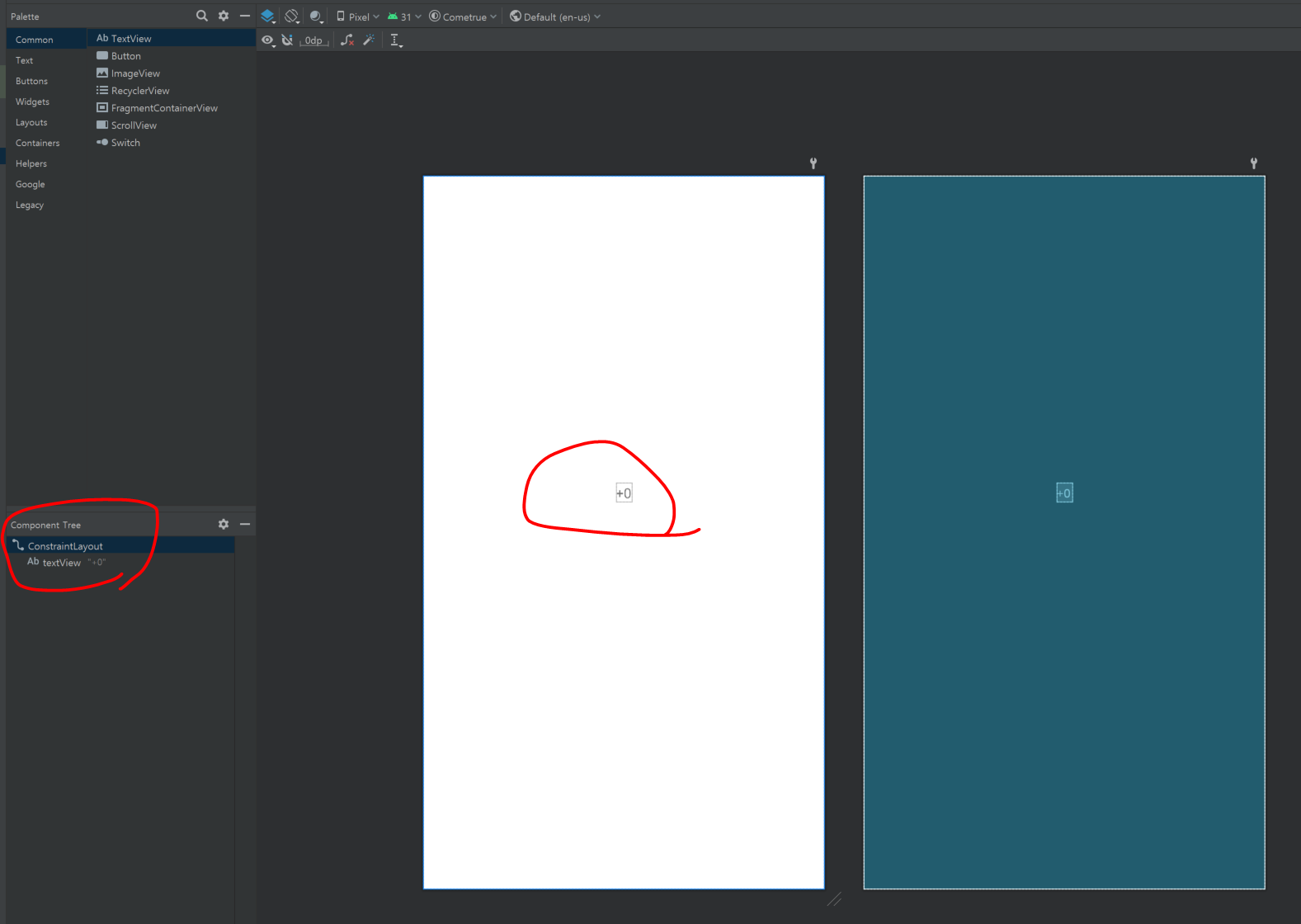 우선 이것저것 끌어다가 추가해봤는데, 제가 원하는 것은 아닌 거 같습니다. 저는 사용자가 입력할 수 있는 화면을 만들고 싶습니다. TextView가 보여주는 것이고, 입력받는 것도 결국 Text가 아닐까? 하는 생각이 들어서 Palette 부분에 Text 탭을 클릭하여 또 이것저것 추가해 보겠습니다.