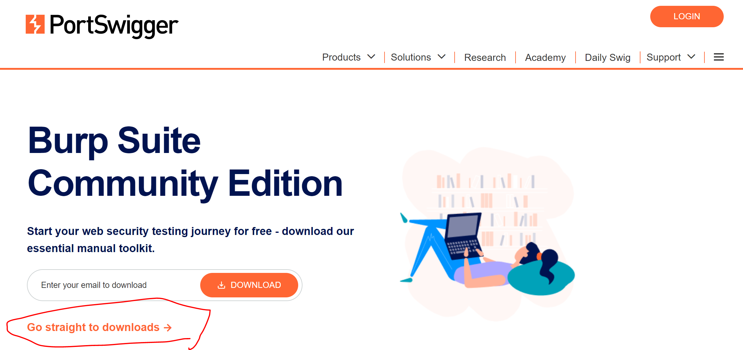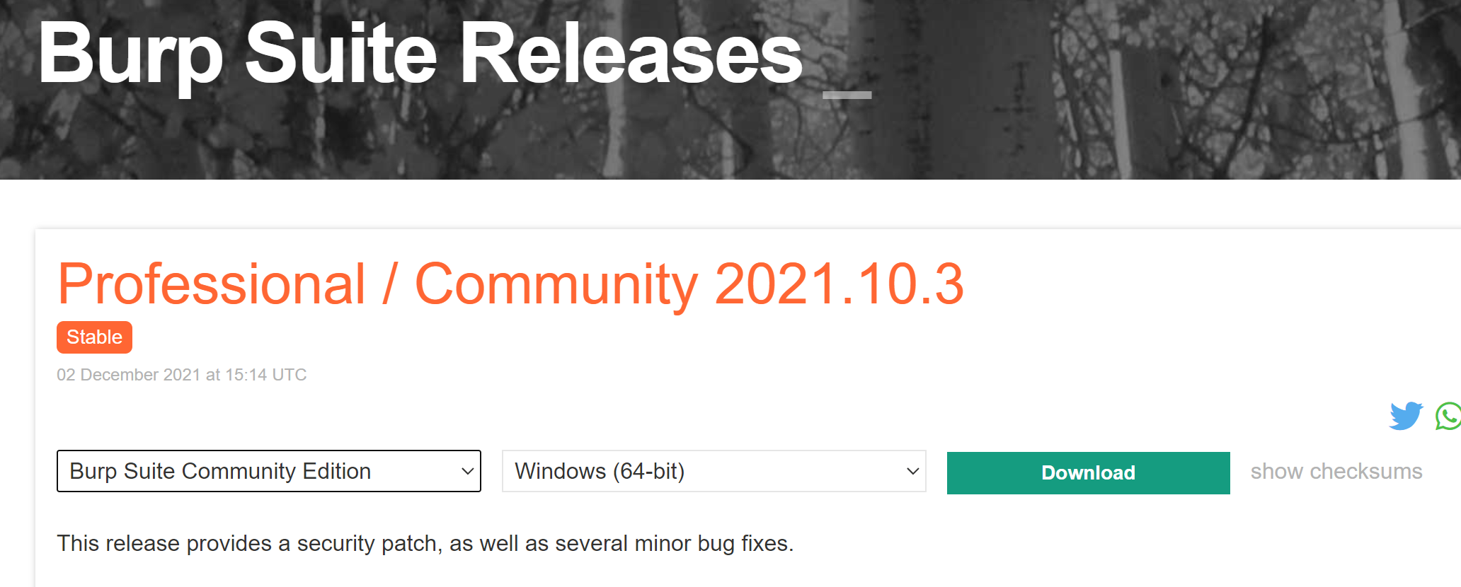 전문가 버전과 무료버전이 있습니다. Burp Suite Community Edition이 무료 버전임으로 선택 박스에서 Burp Suite Community Edition을 클릭하여 다운로드 버튼을 클릭합니다.
