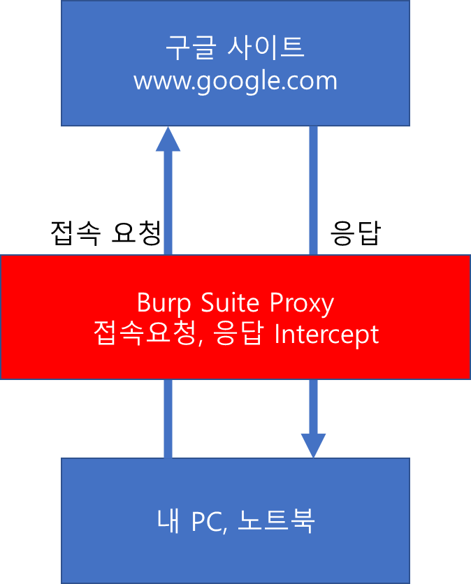 저희 PC나 노트북에서 구글사이트를 접속하려면 PC에서 구글 사이트로 접속 요청을 보내고, 구글 사이트에서는 검색할 수 있는 화면을 저희 PC에 응답을 줍니다. 이런 주고받는 데이터를 Burp Suite Proxy를 사용하여 Intercept 하여 통신 데이터를 확인할 수 있으며 조작할 수 있게 됩니다.
