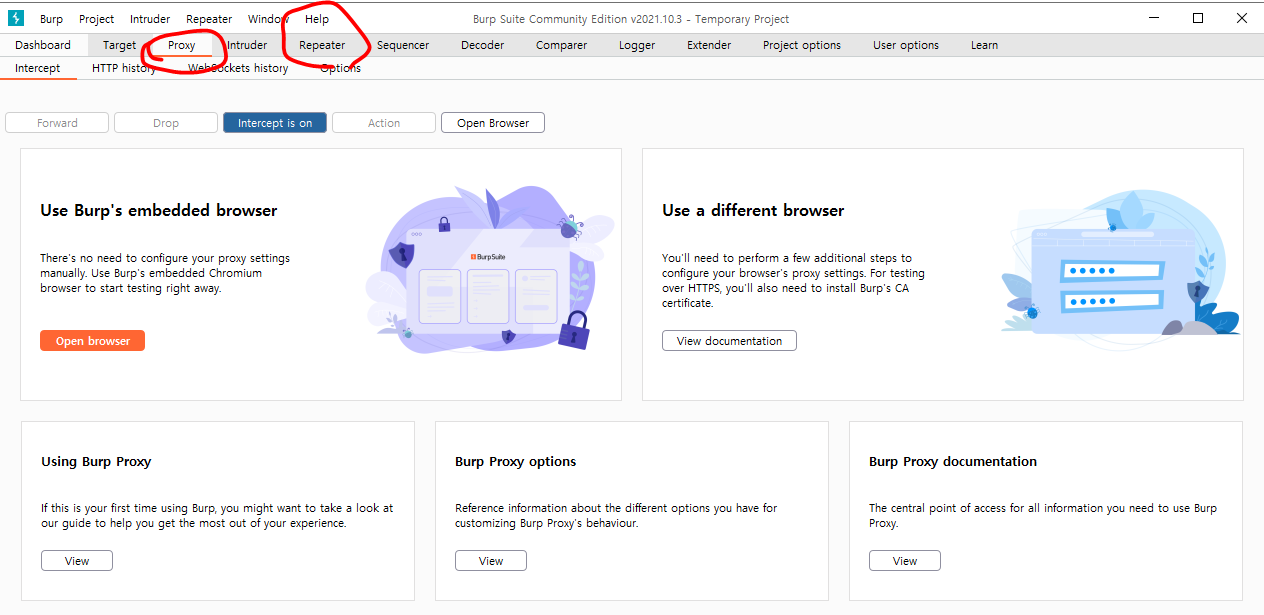 잠시 로딩 화면 후에 여러가지 기능을 가진 프로그램이 실행되며 그중에서도 저희는 Proxy와 Repeater 기능을 자주 사용하게 됩니다. 아래 Burp Sutie Proxy 화면에서 보이는 파란색 버튼에 Intercept is on이라는 글씨가 적혀 있습니다. Intercept라는 영어단어는 훔치다, 뺏어오다 라는 의미로 주로 사용됩니다. 여기서 Intercept의 의미도 동일합니다.
