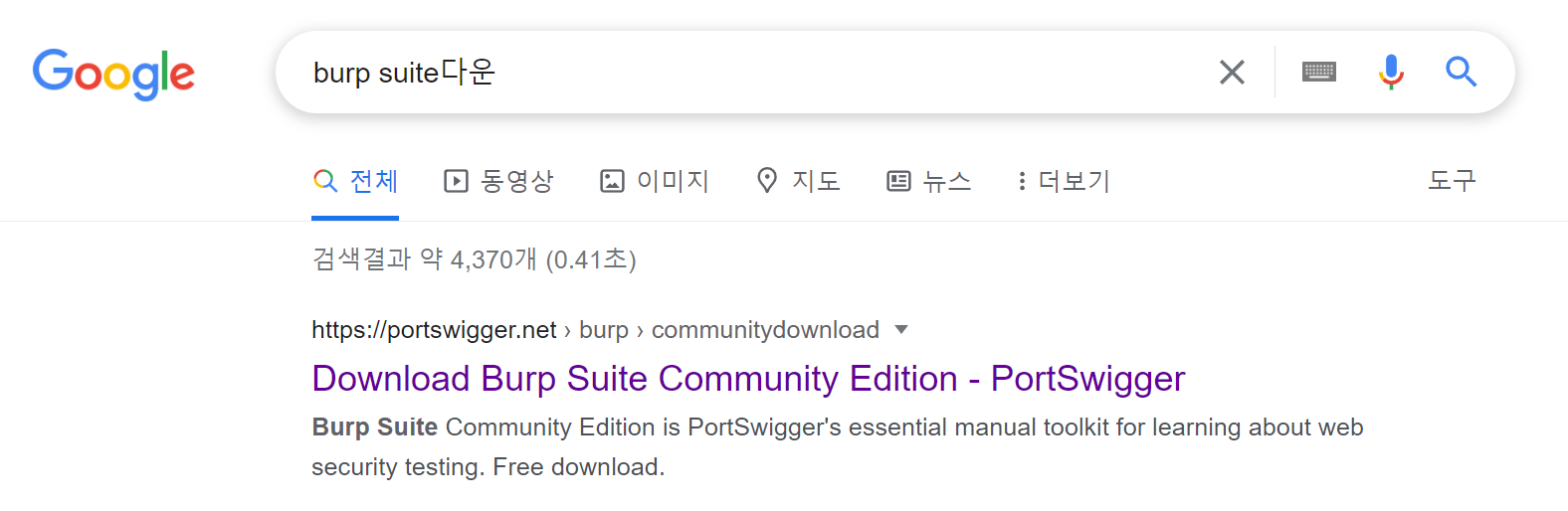 Burp Suite를 다운로드 받으시려고 한다면, 대충 어떤 툴인지 알고 검색하시는 것으로 판단하여 Burp Suite가 어떤 것이며 제조사는 어디입니다. 이런 툴 소개에 대한 글은 생략하고 바로 burp suite 설치하는 방법에 대해 알아보겠습니다. 구글 포탈에서 burp suite 다운으로 검색합니다.