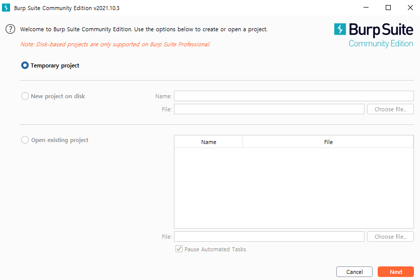 설치 완료 후 Burp Suite를 실행시킵니다. 실행을 시키면 아래와 같은 화면이 보이고, 해당 화면에서는 Burp Suite를 통해 여러가지 작업을 할 건데 그 작업을 임시로만 사용할 것인지 하드디스크에 저장할 것인지 물어보는 화면입니다. 우리는 어디 취약점 분석을 위해 프로젝트를 하는 것이 아니기 때문에 Temporary project를 선택하고 Next 버튼을 눌러줍니다.