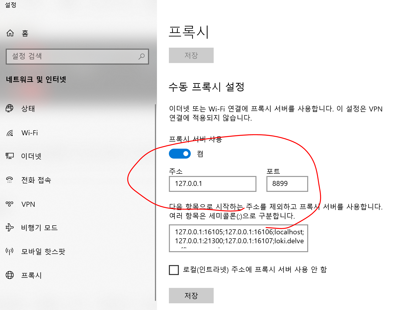윈도우 검색창에서 프록시를 검색하여 프록시 설정 변경이라는 항목을 선택하거나 설정에서 검색하여 아래와 같은 화면으로 접속합니다. 프록시 설정 화면에 들어가기 위한 방법이 있으나, 여기서는 간략하게 설명드립니다. 그리고 프록시 서버 사용을 켬으로 변경하고 우리가 설정한 127.0.0.1 에 8899 포트를 입력해줍니다. 저장까지 진행합니다.