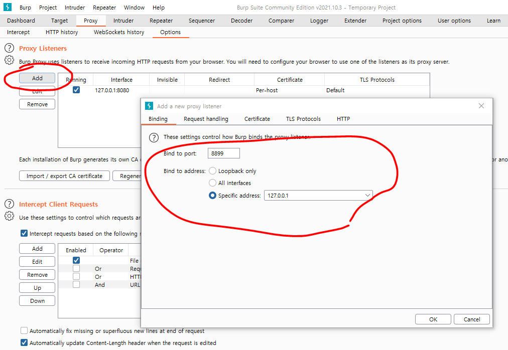 8899 포트 사용하는 것이 없기 때문에, 빈칸으로 확인됩니다. 이제 8899 포트를 사용하기 위해 Burp Suite Proxy 화면에서 ADD 버튼을 눌러 아래 화면에 입력된 값처럼 입력하여 설정합니다.
