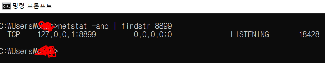 저는 8899포트를 사용하여 실습할 예정으로, 8899 포트가 사용중인 포트인지 확인하기 위해 CMD 명령 프롬프트 창을 열어 netstat -a | findstr 8899 를 입력하여 확인합니다. 확인하는데 까지 시간이 좀 소요될 수 있습니다. 생각보다 PC에서 기본적으로 사용하고있는 포트정보들이 많기 때문에 모든 정보중에 8899 포트를 사용하는 것이 있는지 확인하는 명령어 이기때문입니다. 보통은 빨리 확인 됩니다.