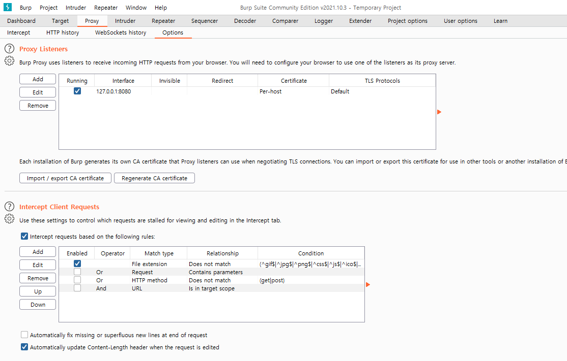 먼저 Proxy 탭을 클릭하여 보면 여러가지 설정할 수 있는 항목들이 보이고 맨처음에 보이는 Proxy Listeners에는 기본적으로 127.0.0.1:8080 으로 설정되어 있습니다. 기본적으로 설정되어 있는 정보를 사용하기 위해서는 사용하시는 PC에 8080포트를 사용하는 서비스가 없어야 합니다.