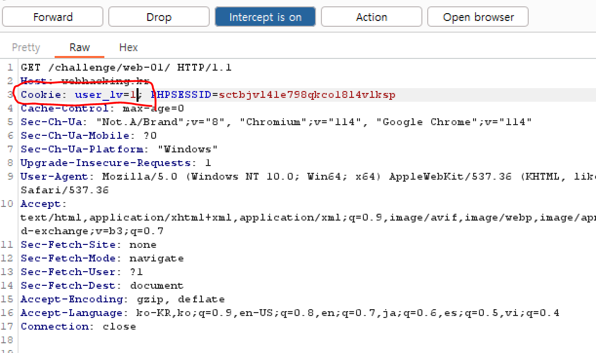 즉, cookie 값을 user_lv 3보다 크고 4보다 작은 값으로 변경하면 문제가 풀립니다. 이 문제를 풀기 위한 방법으로는 여러 가지가 있지만 Burp Suite를 사용해서 풀어보겠습니다.