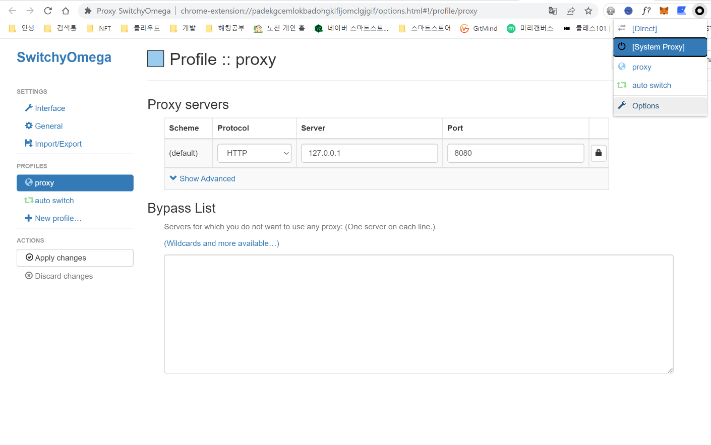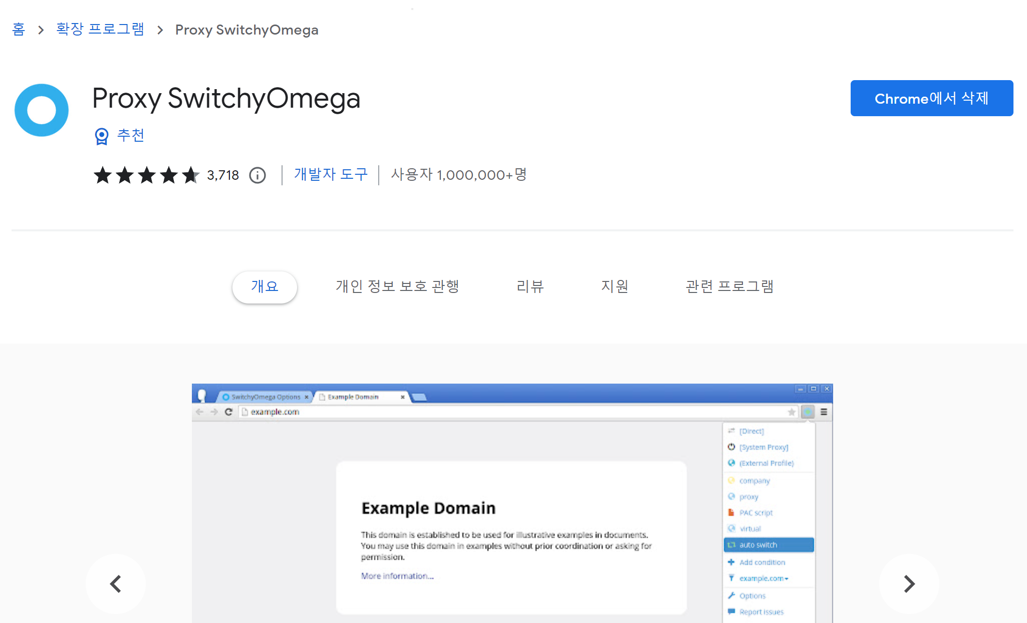 switchyomega는 우리가 PC 설정에 찾아들어가서 IP 입력했다가 지웠다가 해야 되는 번거로움을 덜어주는 프로그램입니다. 크롬 확장 프로그램임으로 당연히 크롬 브라우저에서만 동작합니다.