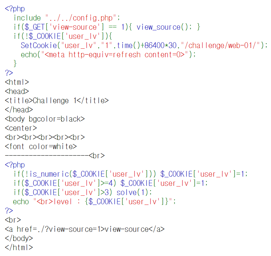 이걸 활용해서 간단한 해킹 연습 문제를 풀어보겠습니다. webhacking.kr 1번 문제입니다. 아래 링크로 접속해서 로그인하고 보시면 아래와 같은 문제를 볼 수 있습니다. view-source를 보면 cookie 값의 user_lv 값이 3보다 크면 solve() 함수가 실행되고 4 이상 이면 user_lv 값을 1로 셋팅하게 됩니다.