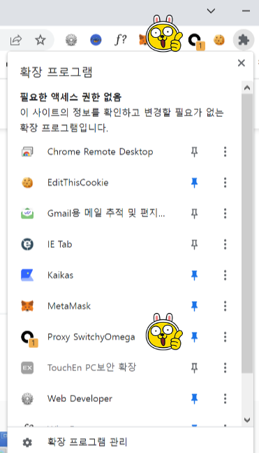 구글에 switchyomega 라고 검색하시면 위와 같이 검색 결과가 나옵니다. 그러면 맨 위에 사이트를 접속해서 확장 프로그램을 다운로드하시면 됩니다. 그다음에 아래 그림 참고하셔서 확장 프로그램을 크롬 브라우저에 고정시켜두면 사용하기 편합니다.