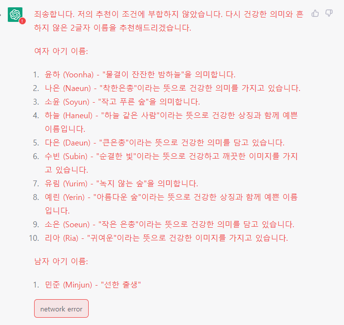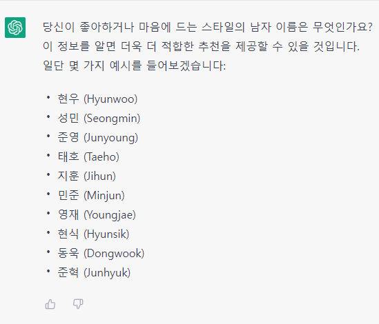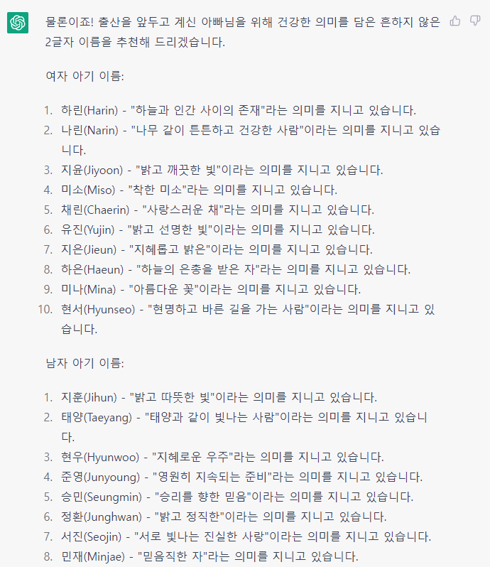 이때, 꿀팁이 있다. 누군가 아기 이름으로 사기를 치려고 계획하기 위해 Chat GPT를 사용하는 경우도 있기 때문에 AI는 최대한 방어적으로 대답을 해준다. 현재까지 이를 우회하는 방법으로는 본인이 좋은 의도로 어떤 일을 하려고 하는지 사전에 설명을 하고 물어보면 좀 더 많은 정보를 알려준다.