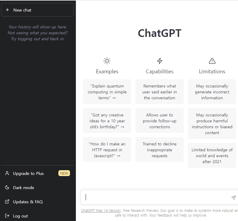 우선, 사용법부터 빠르게 휙! 설명한다. 하단에 누가 봐도 입력하고 싶게 생긴 텍스트 입력 창에 질문을 하면 된다. 그리고 질문을 하면 질문 내용이 왼쪽 화면에 기록이 되어 나중에도 다시 볼 수 있다.