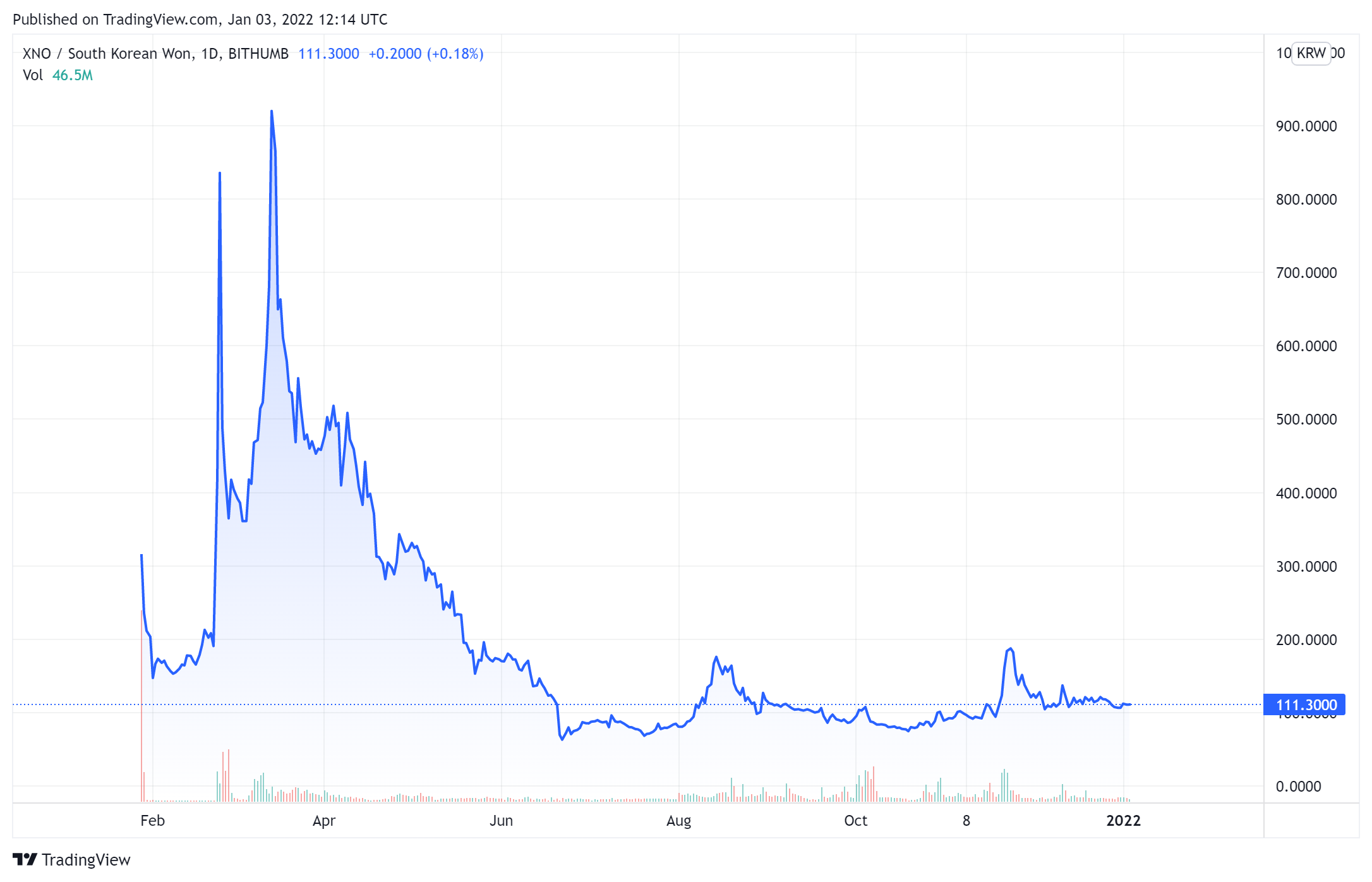 현재 시세는 약 111원에 거래되고 있으며, 차트의 형태는 빗썸 상장 이후 급하락을 했다가 한 달 후에 1200원까지 상승했다가 70원대까지 하락하여 횡보 중인 모습입니다.