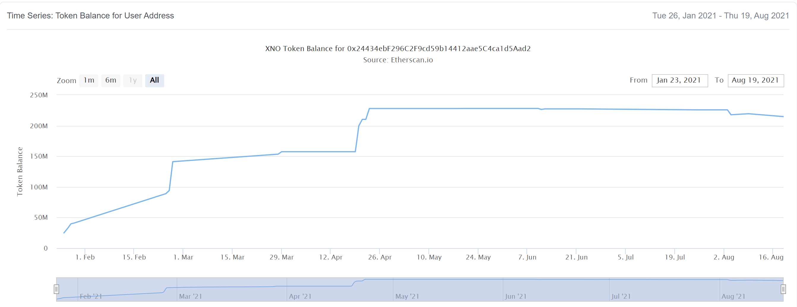 해당 지갑에서 보유하고 있는 누적 토큰 개수를 보겠습니다. 약 2억1천개 정도의 토큰을 보유하고 있습니다. 그런데 좀 이상한 점이 있습니다. 2021년 3월 이후로 계속해서 급락하고 있습니다. 하지만, 10% 지분을 차지하고 있는 지갑에서는 가격이 하락할 때마다 지속적으로 토큰을 매집하는 것으로 보입니다. 21년 8월 19일을 마지막으로 추가 매집을 하지 않고 홀딩 중입니다.