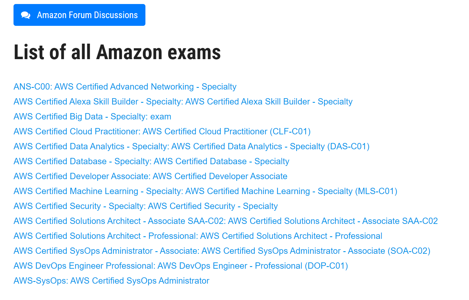 원하시는 aws 자격증 유형을 선택하면, 해당 자격증의 기출문제가 몇 문제 있는지 나오고 파란색 버튼을 클릭하여 기출문제를 보고 문제를 읽고 답이 왜 답인지에 대해 고민을 하면서 공부를 하시거나, 키워드 위주로 7회독 정도 반복해서 보시면 시험에 붙을 수 있습니다. 본인의 취향과 목적 공부기간에 따라 전략을 다르게 하시면 되겠습니다.