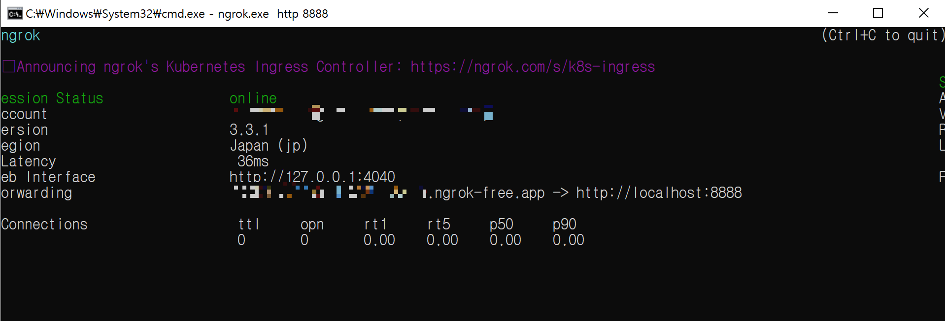 명령 프롬프트 창에서 아래와 같이 입력하여 실행시킵니다. 그러면 아래와 같이 ngrok에서 알아서 도메인을 만들어 주고, 해당 주소로 접속하면 http://localhost:8888로 연결해 준다는 내용이 나옵니다. 저는 ngrok.exe http 8888를 입력하여 http://localhost:8888로 나오는 것입니다.