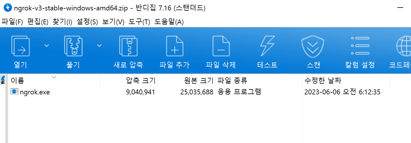 설치는 간단합니다. ngrok 공식 사이트에서 압축파일을 다운로드 받으시면 됩니다. 여기서는 윈도 기준으로 설명드립니다. 우선 아래 링크에 가서 운영체제에 맞는 압축파일을 다운로드합니다. 그러면 아래와 같이 exe 파일이 덜렁 하나 있습니다. 이것으로 설치가 끝입니다.